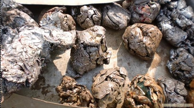 易拉罐粉碎機粉碎后的片狀樣品 易拉罐粉碎機粉碎后的球團(tuán)狀樣品